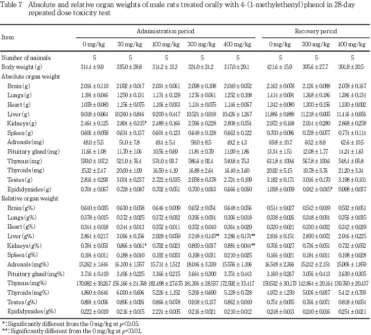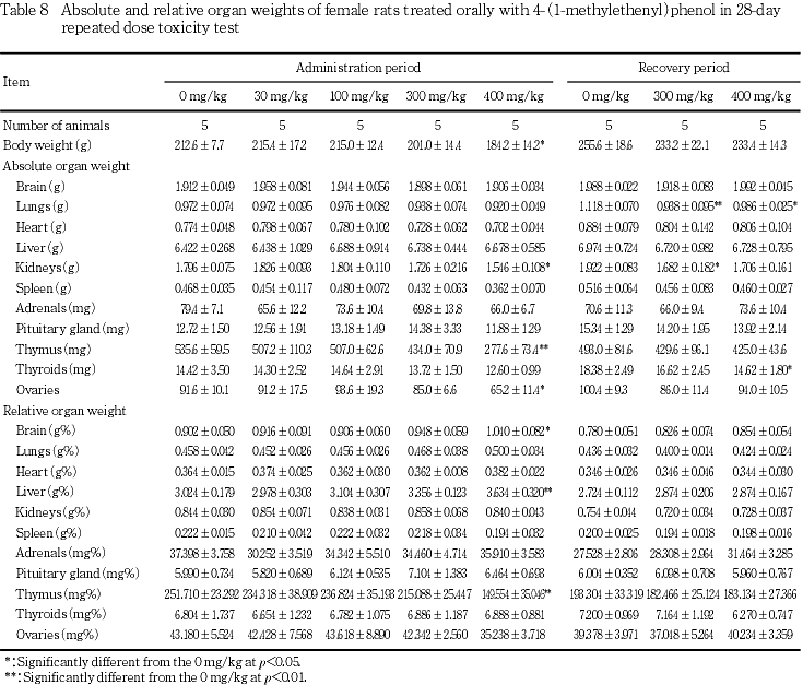回復期間終了時に300 mg/kg投与群の雄で精巣上体の絶対重量に有意な低値,雌で腎臓および肺の絶対重量に低値,400 mg/kg投与群の雌で肺および甲状腺の絶対重量に有意な低値がみられたが,投与終了時にはみられていない変化であり,被験物質投与との関連はないと考えられた.