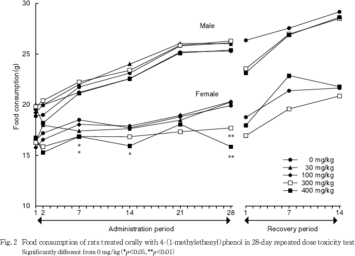 以上により,本試験条件下における4-(1-メチルエテニル)フェノールの無影響量(NOEL)は,雌雄ともに30 mg/kg/dayと考えられた.