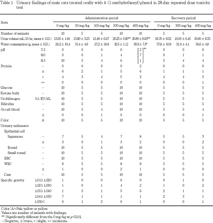 尿検査では,300 mg/kg投与群の雄および400 mg/kg投与群の雌雄で尿量の高値,400 mg/kg投与群の雌雄で尿pHの低下,雄で飲水量の高値,雌で尿比重の低値が認められた.