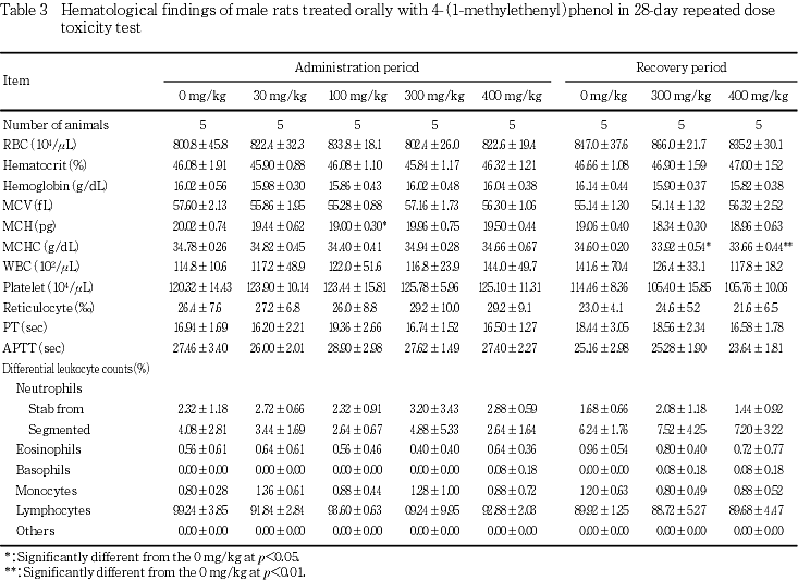 回復期間終了時の300および400 mg/kg投与群の雄で平均赤血球ヘモグロビン濃度の有意な低値が認められた.