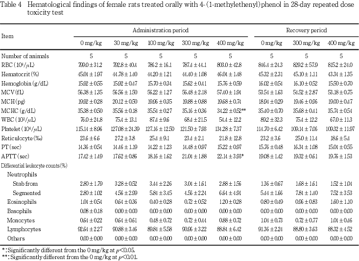 血液学検査では,400 mg/kg投与群の雌で平均赤血球ヘモグロビン濃度の低値および活性化部分トロンボプラスチン時間の延長がみられ,被験物質投与の影響と考えられた.一方,雄の300および400 mg/kg投与群で回復終了時に平均赤血球ヘモグロビン濃度の低値がみられ,雌と同様に被験物質投与の影響が遅れて発現したものと考えられた.