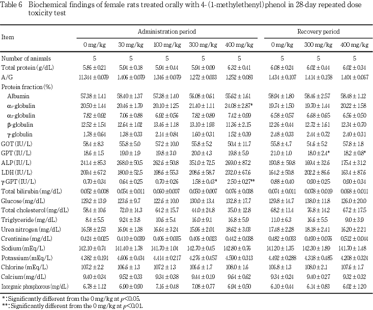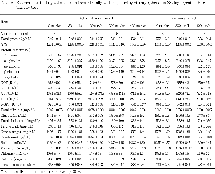 血液生化学検査では,300 mg/kgの投与群の雌および400 mg/kg投与群の雌雄でγ-GTPに高値,400 mg/kg投与群の雄でβ-グロブリン比の高値,雌でα1-グロブリン比の高値が認められた.これらの変化は被験物質投与の影響と考えられた.
