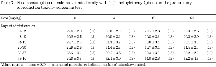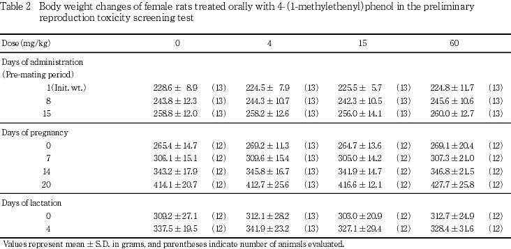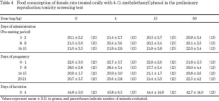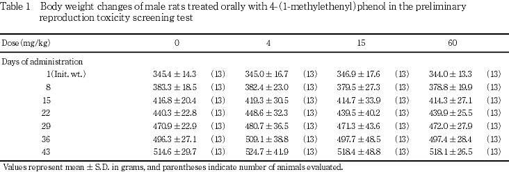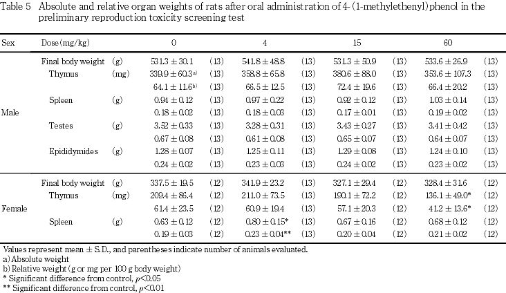 以上の成績から,本試験条件下における4-(1-メチルエテニル)フェノールの親動物に対する無作用量は,15 mg/kg/day,生殖毒性に関する無作用量は,親動物および出生児ともに60 mg/kg/dayと判断された.