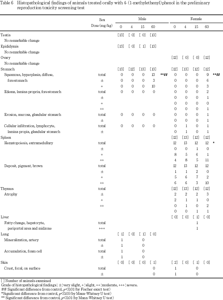 雌動物のうち,分娩した雌は哺育4日に,交尾しなかった雌は投与54日の翌日にそれぞれ致死量のペントバルビタールナトリウム麻酔下で放血・致死させ,剖検した.その際,胸腺および脾臓の重量を測定し,卵巣および子宮は摘出して,卵巣については実体顕微鏡下で妊娠黄体数を,子宮については着床数を数え,着床率[(着床数/妊娠黄体数)× 100]を算出した.卵巣は,対照群および60 mg/kg投与群について病理組織学検査を実施した.胃については,60 mg/kg投与群で剖検時に異常が認められたため,4および15 mg/kg投与群についても病理組織学検査を実施した.また,胸腺は60 mg/kg投与群で,脾臓は4 mg/kg投与群で重量に有意差が認められたため,病理組織学検査を実施した.その他,剖検時に観察された病変部(肝臓,脱毛部の皮膚)についても病理組織学検査を実施した.