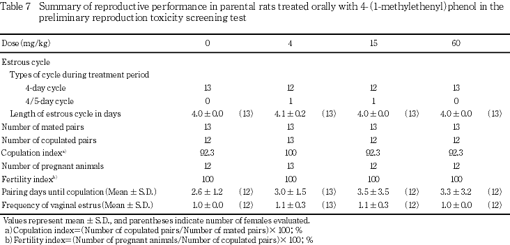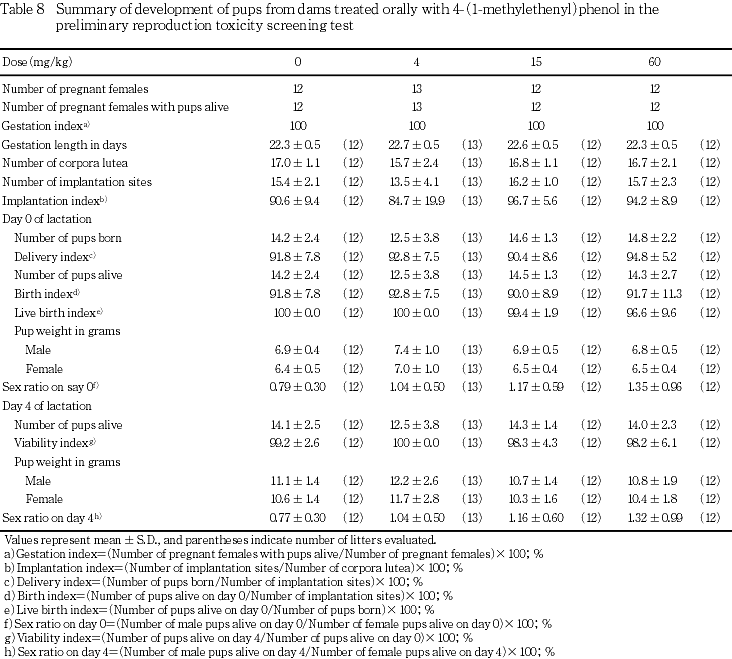 以上の結果から,本試験条件下における4-(1-メチルエテニル)フェノールの親動物に対する無作用量は,15 mg/kg/day,親動物の生殖能力および出生児に対する無作用量は,60 mg/kg/dayと考えられる.