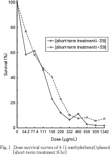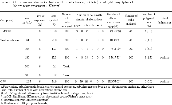 以上の結果より,本試験条件下では4-(1-メチルエテニル)フェノールは,染色体異常を誘発する(陽性)と結論した.