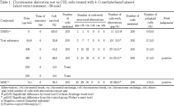 4-(1-メチルエテニル)フェノールの培養細胞に及ぼす細胞遺伝学的影響について,チャイニーズ・ハムスター培養細胞(CHL/IU)を用いて染色体異常試験を実施した.