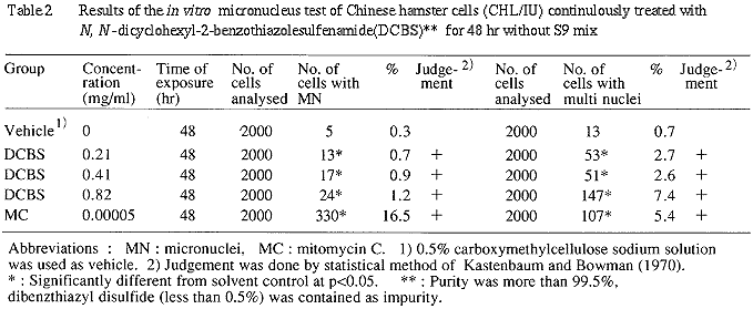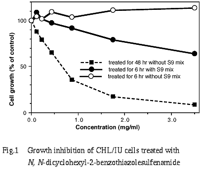 従って,N, N-ジシクロヘキシル-2-ベンゾチアゾールスルフェンアミドは,上記の試験条件下で,試験管内の CHL/IU 細胞に染色体異常を誘発すると結論した.