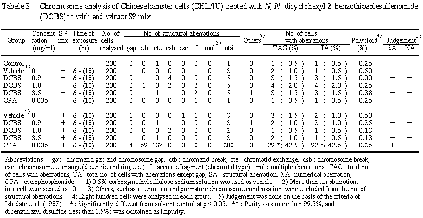 N, N-ジシクロヘキシル-2-ベンゾチアゾールスルフェンアミドを加えて S9 mix 存在下および非存在下で 6時間処理したすべての処理群で,染色体の構造異常および倍数性細胞の誘発作用は認められなかった.