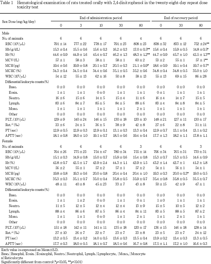 回復期間終了時の検査において,80 mg/kg群で雄に赤血球数,ヘモグロビン量,ヘマトクリット値の有意な減少,平均赤血球容積および平均赤血球血色素量の有意な増加が認められた.30 mg/kg群では雌に平均赤血球血色素量の有意な増加が認められたが,用量依存性の認められない変化であった.