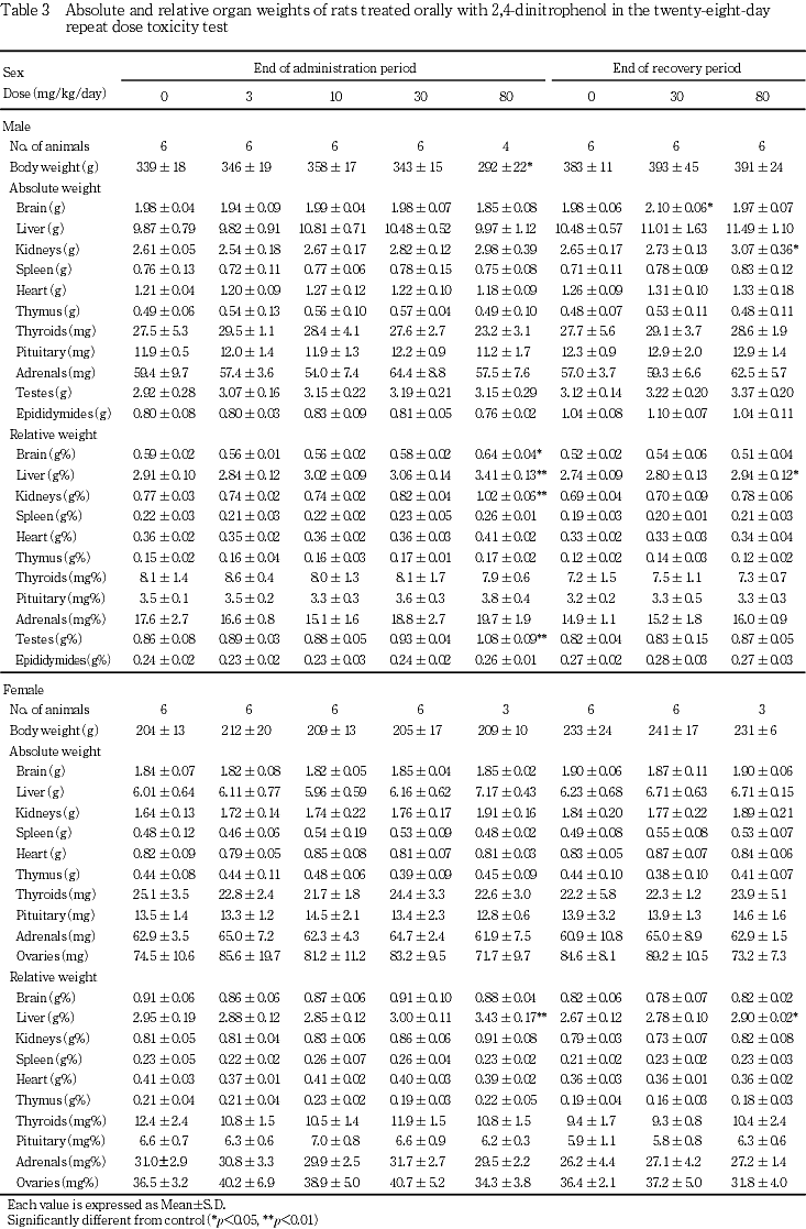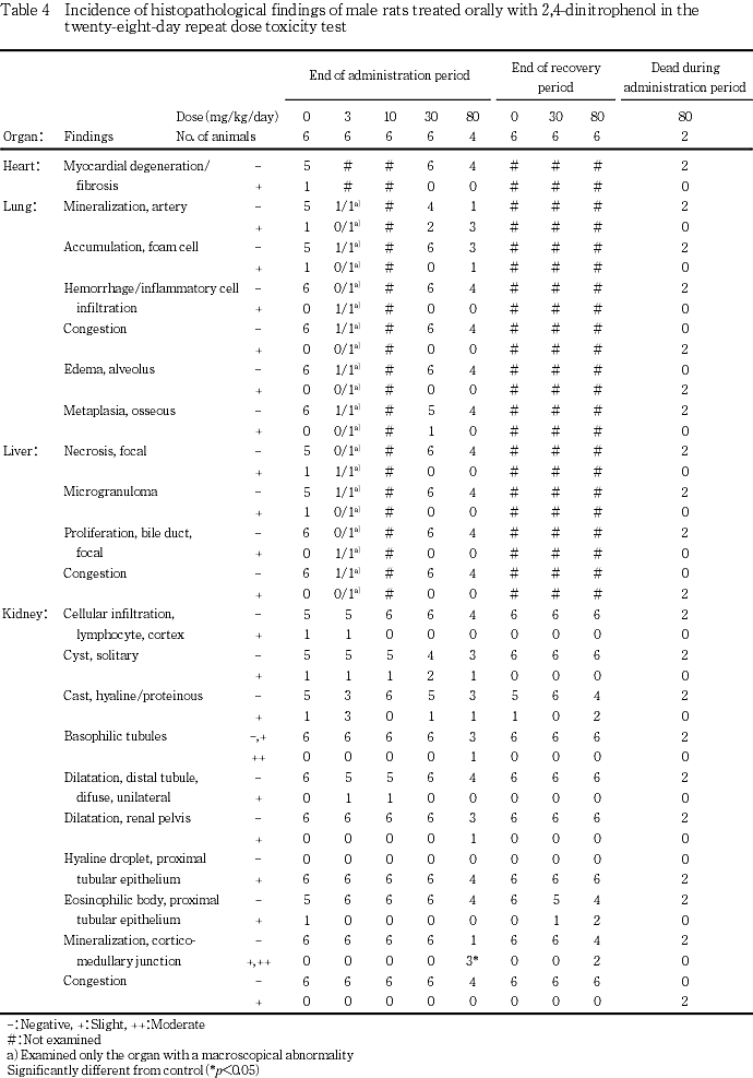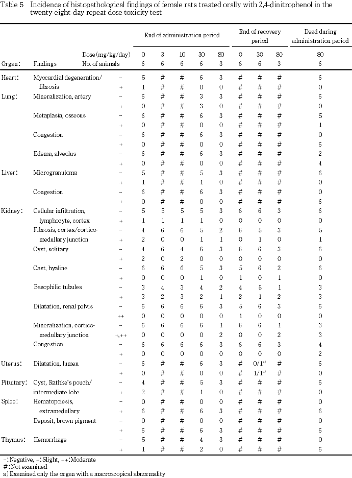 以上の結果から,2,4-ジニトロフェノールのラットへの28日間反復経口投与により認められた主な毒性影響は,30 mg/kg以上の群の雌雄の一般状態の変化ならびに雄の血清中塩素濃度の減少,80 mg/kg群の雌雄の死亡,雄の多血症,尿比重の低下,腎臓および肝臓の相対重量増加,脾臓および腎臓の病理組織学変化ならびに雌の肝臓の相対重量増加であった.したがって,無影響量は,雌雄とも10 mg/kg/dayと推定された.