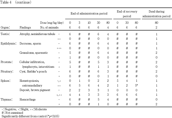 回復期間終了時屠殺動物において,腎臓に皮髄境界部の軽度な鉱質沈着が80 mg/kg群で雄の4匹中2匹および雌の3匹中2匹に認められた.また,脾臓に髄外造血巣の有意な増加が80 mg/kg群で雄に認められた.剖検で被験物質投与とは無関係に認められた雄の精巣上体の結節には精子肉芽腫,肺の赤色点には出血を伴った炎症性細胞浸潤巣,肝臓の横隔膜結節には胆管増生巣および巣状壊死,胸腺の赤色斑には出血が,雌の水腎症には腎盂拡張,子宮腔水腫には内腔拡張が認められた.