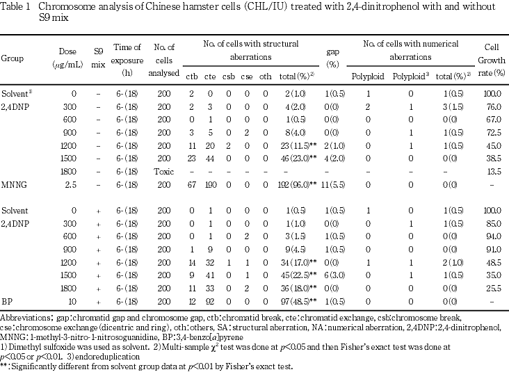 以上の成績から,2,4-ジニトロフェノールは,CHL/IU細胞に対し染色体異常を誘発する(陽性)と結論した.