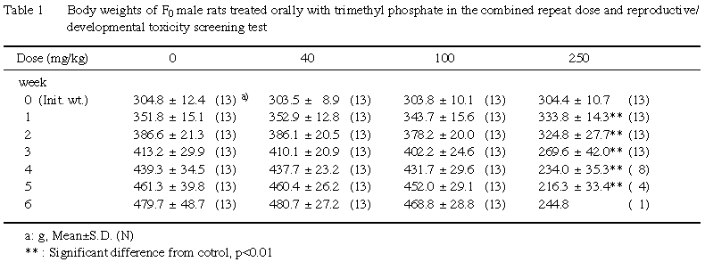 雌雄とも,全例について体重を試験期間中週1回〔雄:投与0,7,14,21,28,35,42日,雌:投与0,7,14,21日〕および解剖日に測定した.また,交尾成立雌では妊娠0,7,14,20日,分娩した雌では分娩後0および4日(哺育0および4日)の体重を測定した.