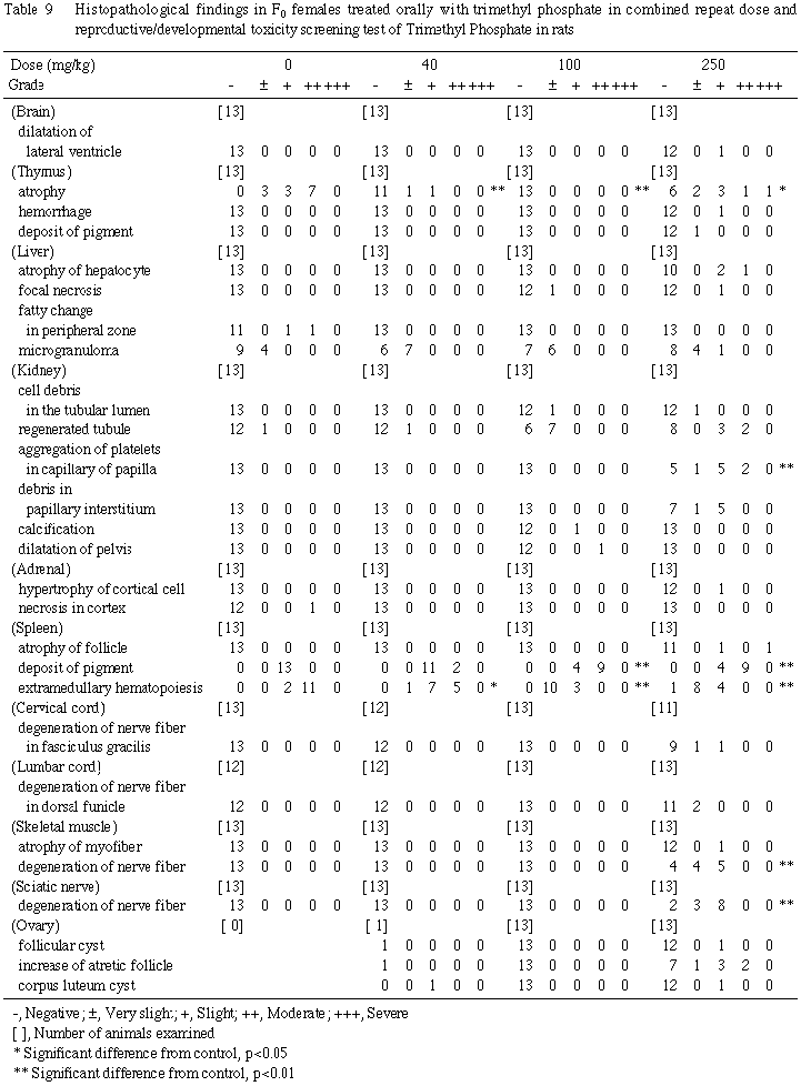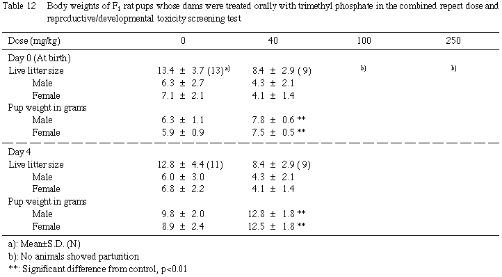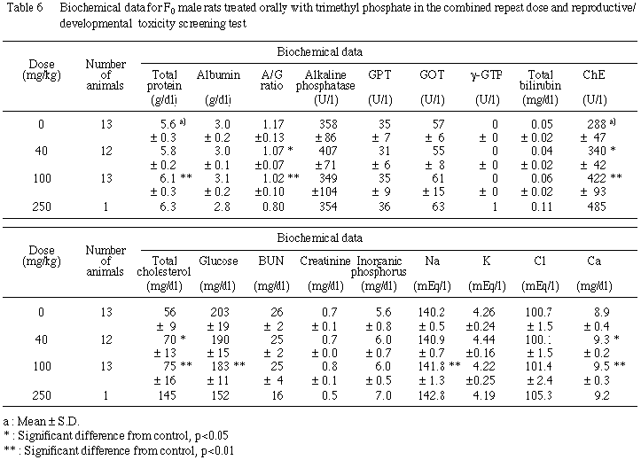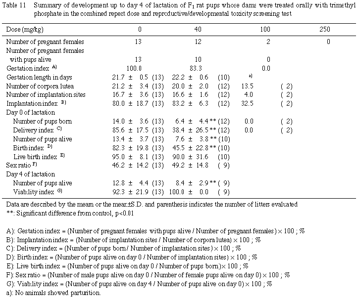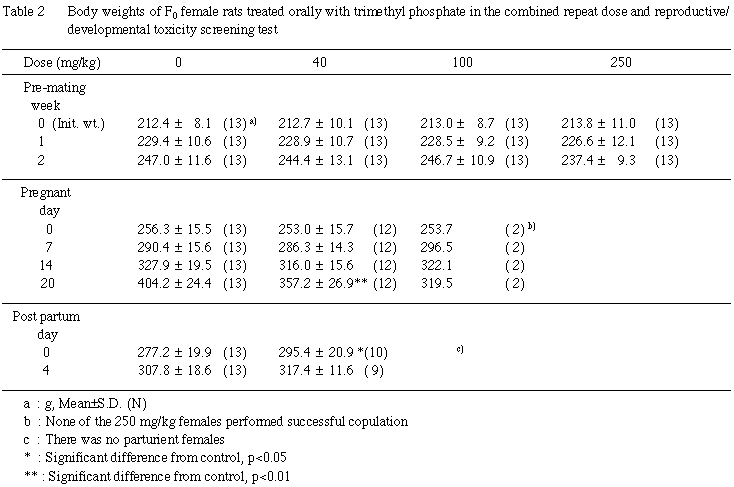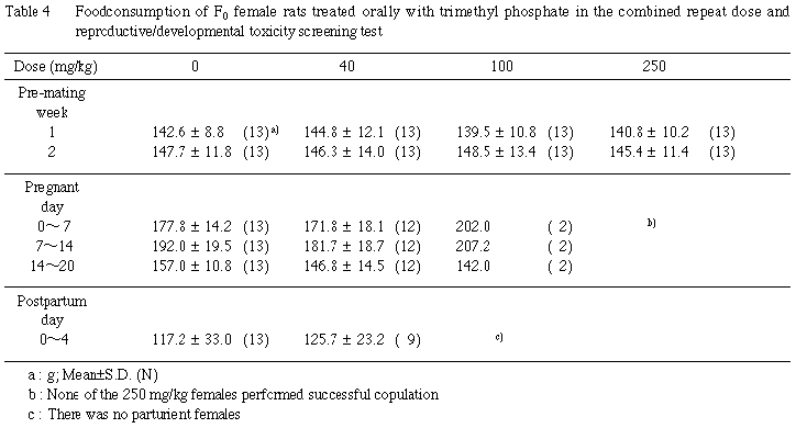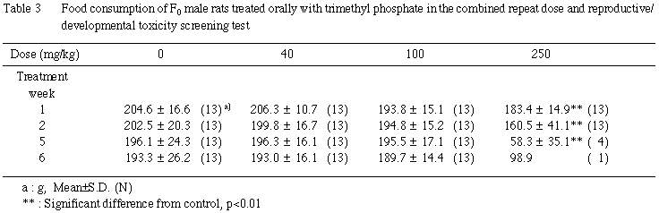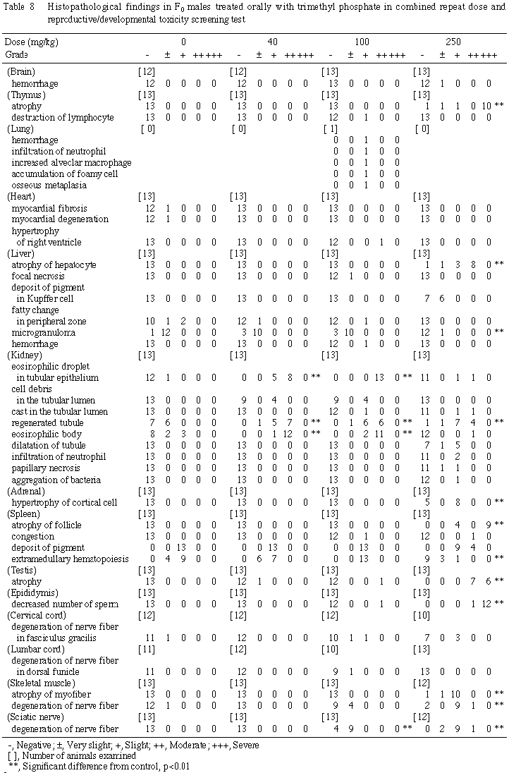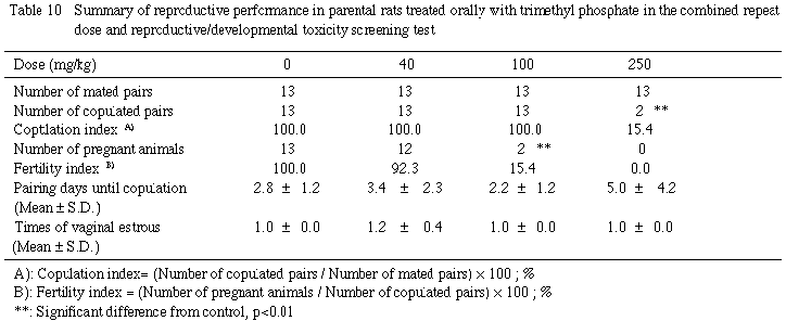 本試験条件下では,リン酸トリメチルの反復投与毒性および生殖発生毒性に関する無毒性量は,雌雄ともにいずれも 40 mg/kg/day を下回る量と推定される.