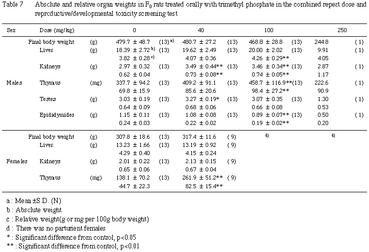 用量依存的な変化として腎臓重量とその比体重値の有意な増加が 40 および100 mg/kg 投与群に,胸腺重量とその比体重値,肝臓の比体重値の有意な増加ならびに精巣上体重量とその比体重値の有意な低下が 100 mg/kg投与群に認められた.250 mg/kg 投与群の生存例1例では,低体重であることと関連して測定器官の重量は全て対照群の平均値を下回った.比体重値では胸腺,肝臓,腎臓の比体重値が高値を示したが,精巣および精巣上体の比体重値は対照群と比較して低値であった.