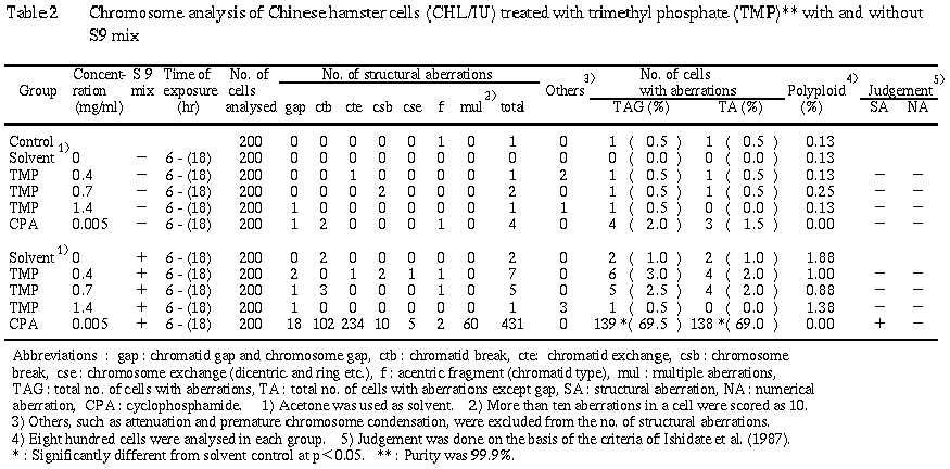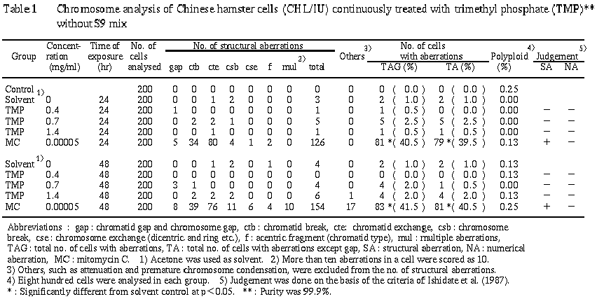 リン酸トリメチルを加えて S9 mix 存在下および非存在下で 6時間処理したいずれの処理群においても,染色体の構造異常および倍数性細胞の誘発作用は認められなかった.