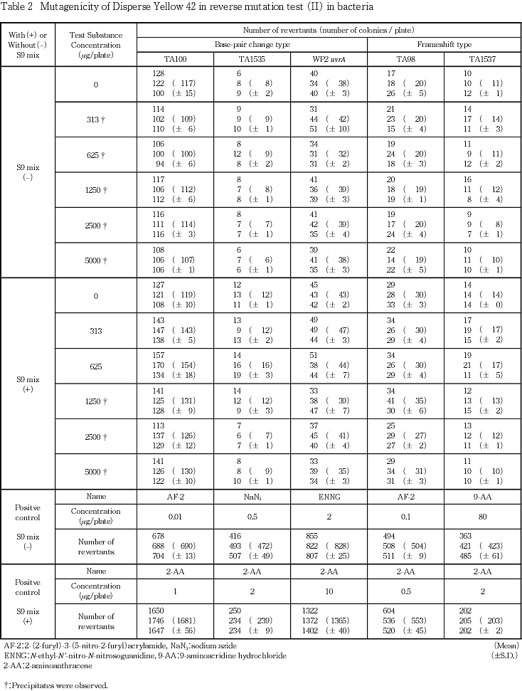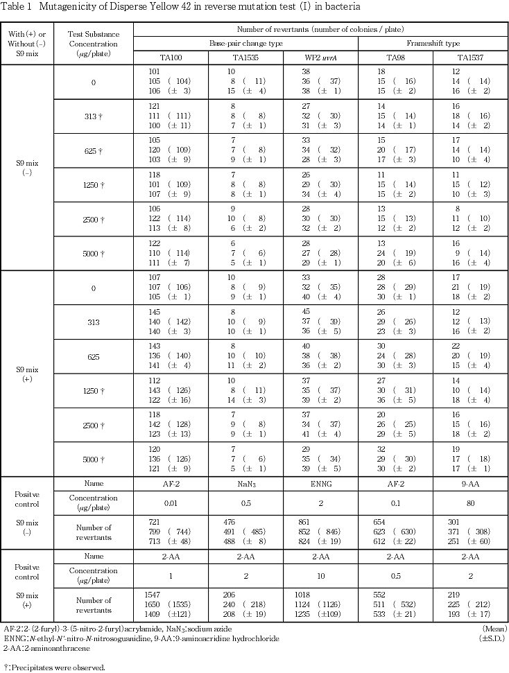 以上の結果から,ディスパーズイエロー42は本試験系において変異原性を有さない(陰性)と判定した.