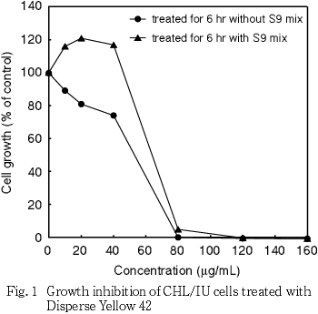 その結果,ディスパーズイエロー42の約50 %の増殖抑制を示す濃度を,生存曲線において細胞増殖率が50 %前後を示す2点を結ぶ直線式より算出したところ,短時間処理法のS9 mix存在下および非存在下でそれぞれ51,40.1 μg/mLであった(Fig. 1).