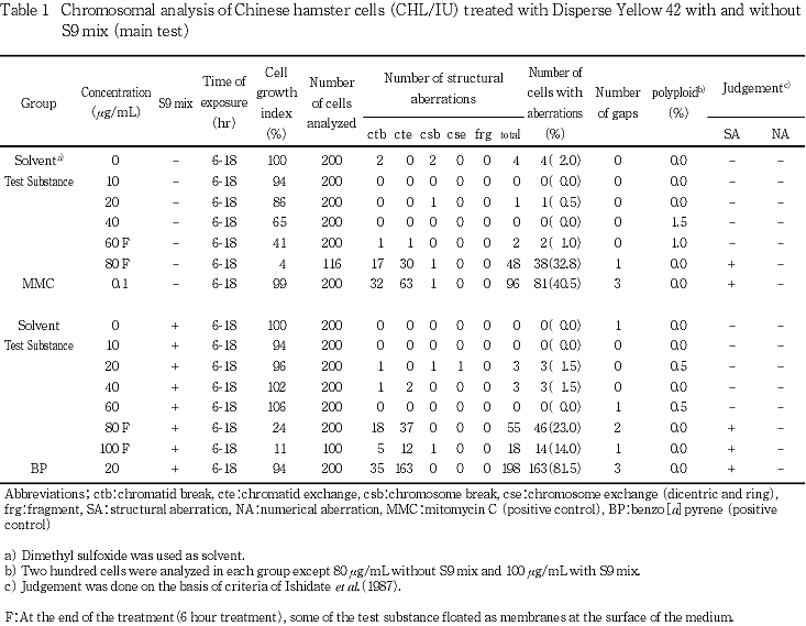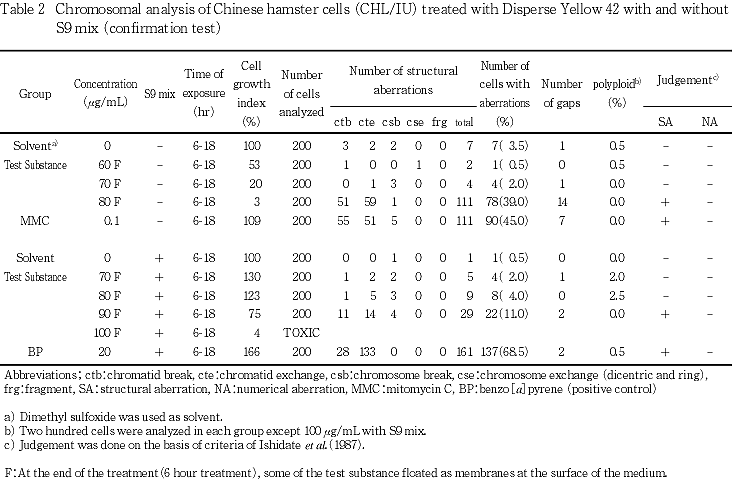 以上の結果より,本試験条件下ではディスパーズイエロー42は,染色体異常を誘発する(陽性)と結論した.