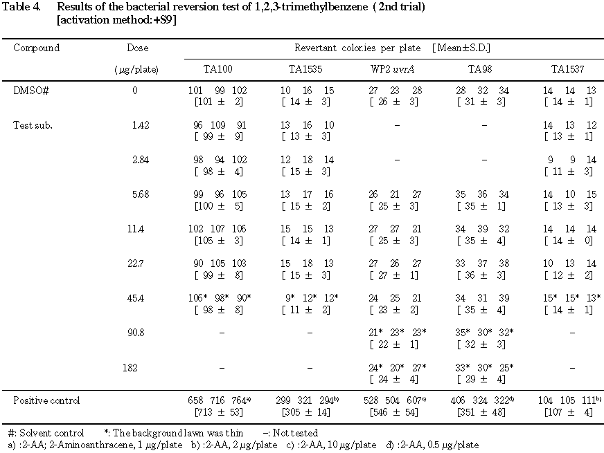 Table 1〜4に示した.直接法(-S9 mix)ならびに代謝活性化法(+S9 mix)のいずれとも高用量群において,1,2,3-トリメチルベンゼン処理による生育阻害作用が観察された.また,復帰突然変異コロニー数については,直接法,代謝活性化法とも溶媒対照と同等の値であり,明確な増加傾向は認められなかった.一方,陽性対照物質はそれぞれの菌株において,溶媒対照群の2倍以上の復帰突然変異コロニーを誘発した.なお,S9 mix添加時182 μg/プレートの用量において,試験管内の反応液が僅かに白濁したが,コロニー計数時には析出等の特筆すべき変化は観察されなかった.以上の試験結果から,本試験条件下において1,2,3-トリメチルベンゼンの微生物に対する遺伝子突然変異に関し,陰性と判定した.