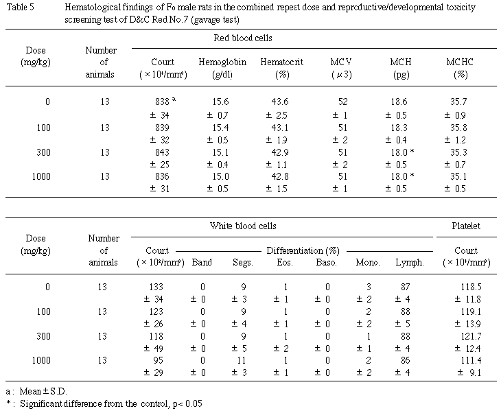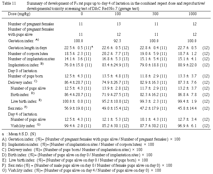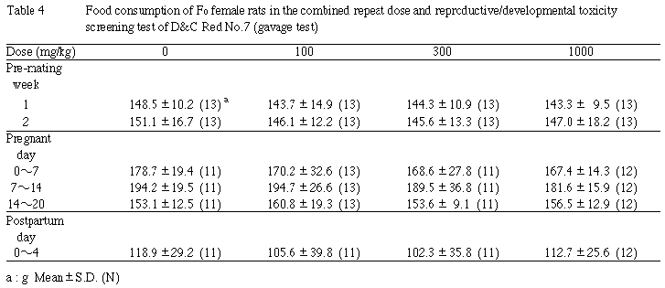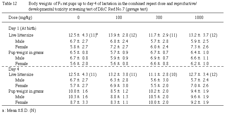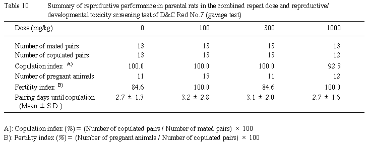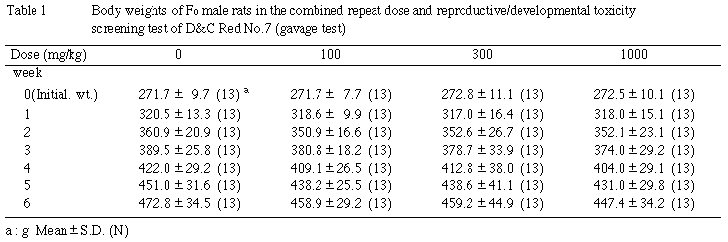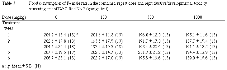 本試験では,OECDによる既存化学物質の安全性点検に係わる毒性調査事業の一環としてD&C Red No.7の0(溶媒対照),100,300および1000mg/kgをSprague-Dawley系ラットの雌雄(各13匹/群)に交配前2週間および交配期間2週間を通して経口投与し,さらに雄では交配期間終了後2週間,雌では妊娠期間を通して分娩後哺育3日まで投与を継続して親動物に対する反復投与毒性およびその生殖能力ならびに次世代児の発生・発育に及ぼす影響について検討した.