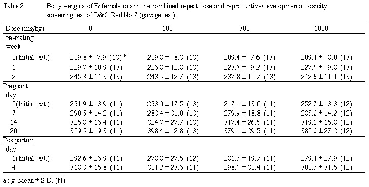 雌雄とも,全例について体重を試験期間中週1回〔雄:投与0,7,14,21,28,35,42日,雌:投与0,7,14,21日〕および解剖日に測定した.また,交尾成立雌では,妊娠0,7,14,20日,分娩した雌では,哺育0および4日の体重を測定した.