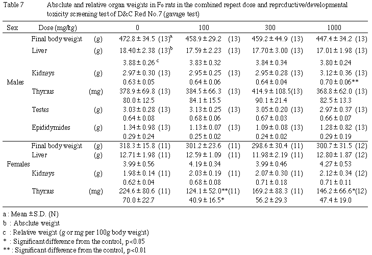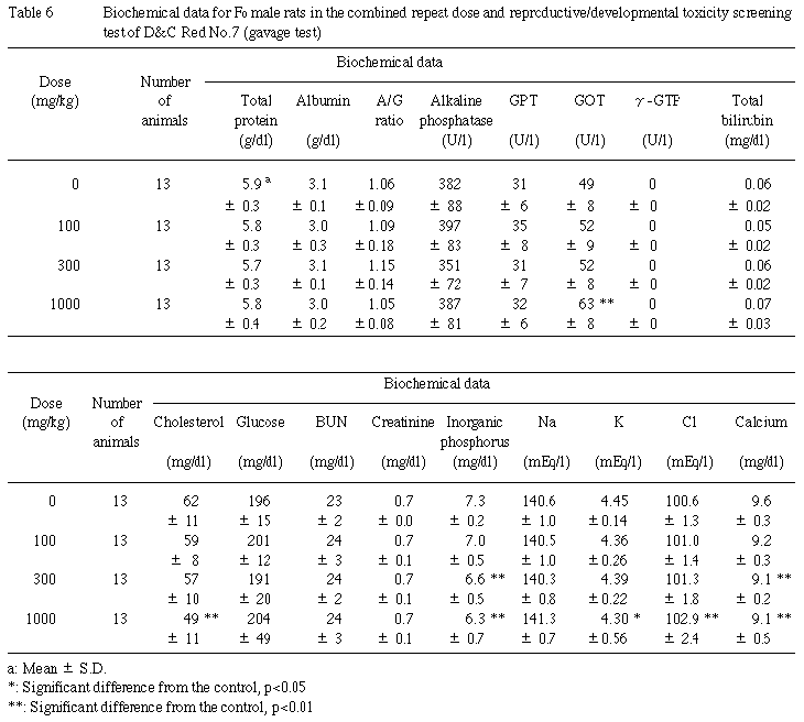 その結果,D&C Red No.7は,雄では300mg/kg,雌では100mg/kg以上のほぼ6週間にわたる反復投与によって,雌雄ラットの腎に器質的変化を来し,雄ではこの変化に起因するとみられる血液生化学的検査値の変動が認められた.しかし,1000mg/kgの投与によっても全身毒性を示唆する毒性変化は発現せず,生殖発生毒性学的な影響はなんら認められなかった.このことから本試験条件下では,D&C Red No.7の反復投与毒性に関する無影響量は,雄では100mg/kg/day,雌では100mg/kg/day未満であり,また,生殖発生毒性に関するそれは,雌雄ともに1000mg/kg/dayと推察される.