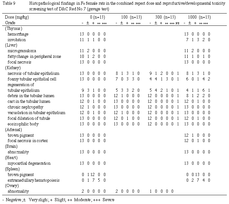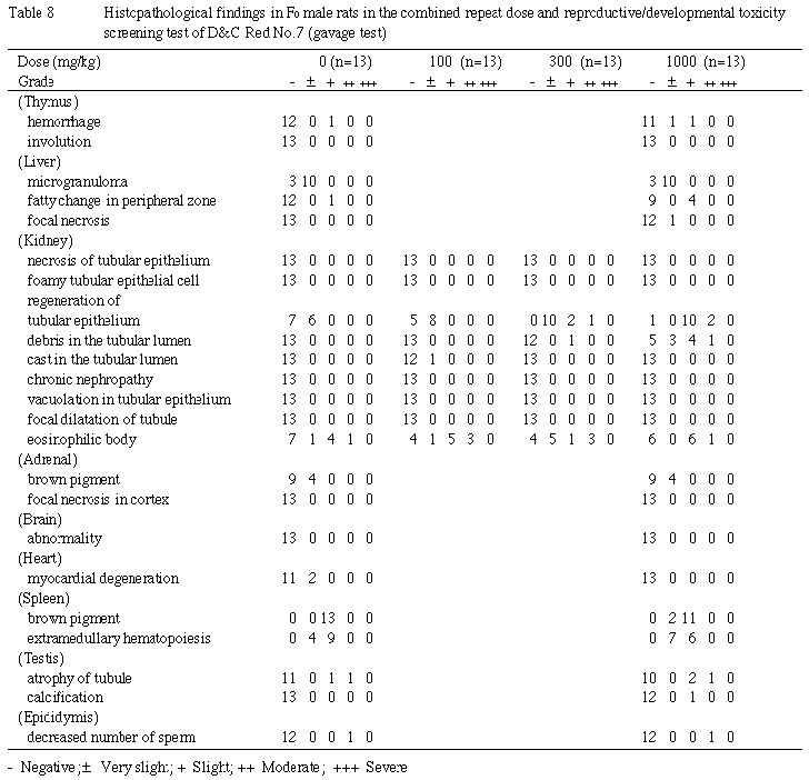 褐色色素の沈着および髄外造血が,対照群および1000mg/kg投与群の両群にみられたが,頻度および程度に明らかな差はなかった.