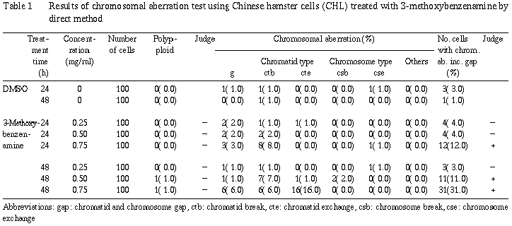 染色体異常の観察は、各濃度当り100個の分裂中期像について行い、染色分体型あるいは染色体型の構造異常(ギャップ、切断、交換など)をもつ細胞の出現頻度を記録した。さらに、倍数体(染色体数が倍化した細胞)についても併せて記録した。結果の判定は、未処理及び溶媒処理の対照群では通常4%以上の異常はみられないため、5%未満を陰性(−)、5%以上10%未満を疑陽性(±)、10%以上を陽性(+)とした。