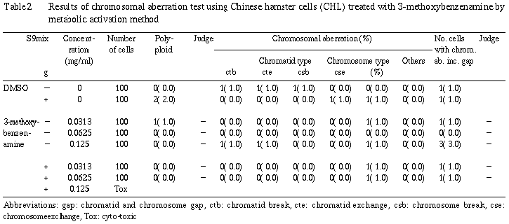 一方、代謝活性化法においては、細胞毒性により染色体異常の観察が出来なくなる濃度まで検討したが、染色体は観察されなかった。