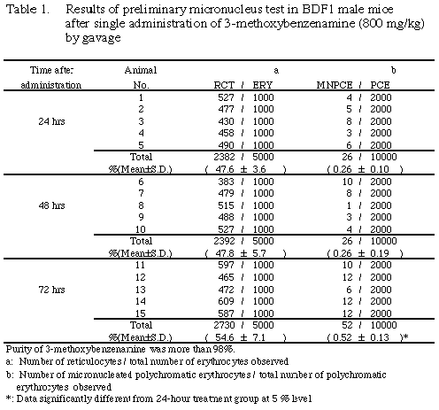 3−メトキシベンゼナミンの毒性予備試験を行った結果、Crj: BDF1雄および雌マウスにおける最大耐量は、それぞれ1000 mg/kgおよび600 mg/kgであった。そこで、小核予備試験および小核本試験における3−メトキシベンゼナミンの高用量を雄は1000 mg/kgとし、雌は600 mg/kgとした。