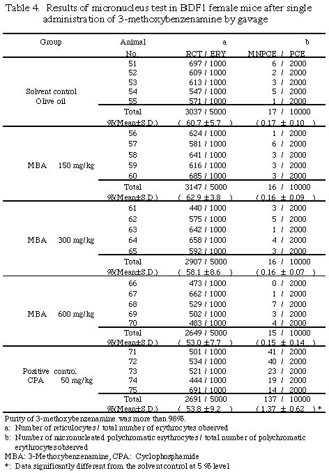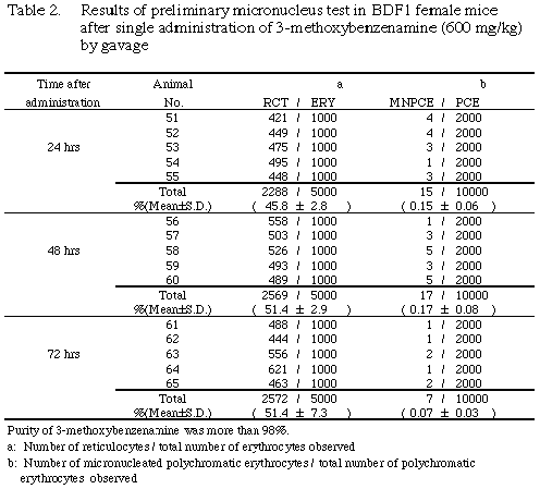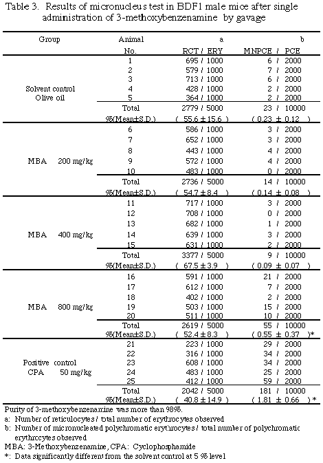 なお、当研究所において調製検体の室温における安定性試験を実施した。すなわち、3−メトキシベンゼナミンを(局)オリブ油に懸濁して15 mg/ml溶液(投与容量をマウスの体重当たり10 mlとした場合に150 mg/kgに相当)および80 mg/ml溶液(同800 mg/kgに相当)を調製し、分析化学研究室で高速液体クロマトグラフィー(HPLC)を用いて、調製直後および7日後の含量を測定した。その結果、両調製検体の調製7日後の平均含量比は調製時のそれぞれ99.5および109%であった。したがって、小核本試験で用いた濃度範囲おける調製検体は、室温で調製後7日間安定であることが確認された。