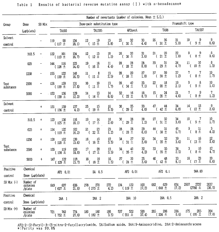 検定菌としてSalmonella typhimurium TA100、TA1535、TA98、TA1537およびEscherichia coli WP2 uvrAを用い、直接試験および代謝活性化試験のいずれも、用量設定試験は50〜5000 μg/プレートの用量で、本試験は312.5〜5000 μg/プレートの用量で試験を行った。その結果、2回の本試験とも、用いた5種類の検定菌について、いずれの用量でも復帰変異コロニー数の増加が認められなかったことから、n−ヘキサデカンは、用いた試験系において変異原性を有しない(陰性)と判定された。