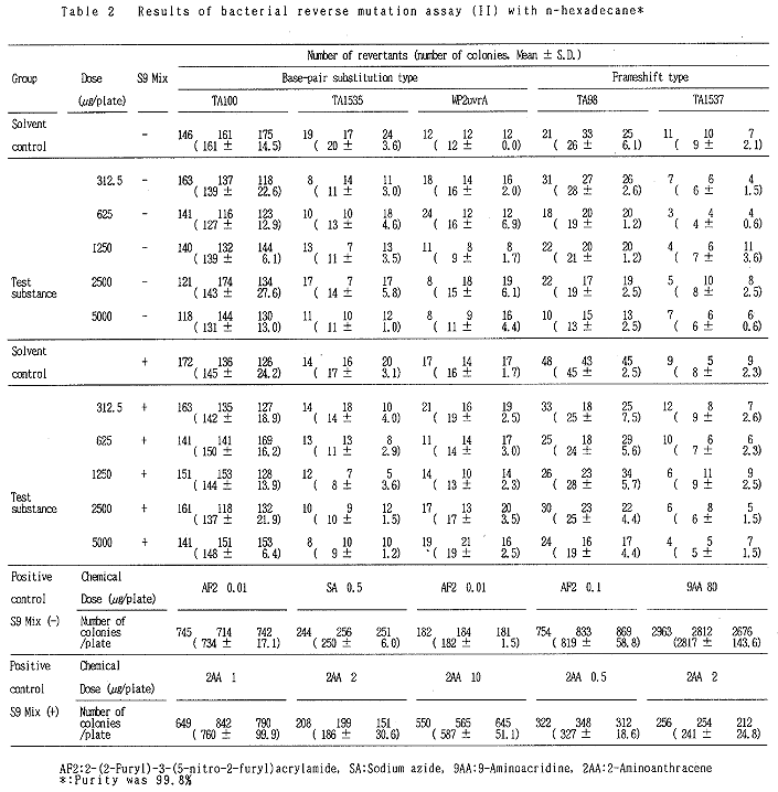 以上の結果に基づき、n−ヘキサデカンは、用いた試験系において変異原性を有しないもの(陰性)と判定した。