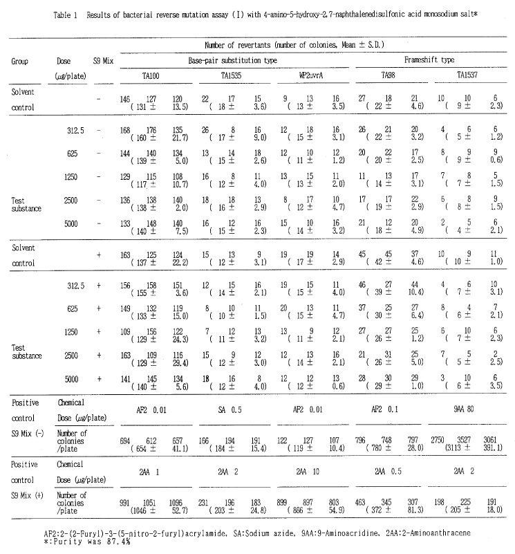 その結果、2回の本試験とも、用いた5種類の検定菌について、いずれの用量でも復帰変異コロニー数の増加が認められなかったことから、4−アミノ−5−ヒドロキシ−2, 7−ナフタレンジスルホン酸モノナトリウムは、用いた試験系において変異原性を有しない(陰性)と判定された。