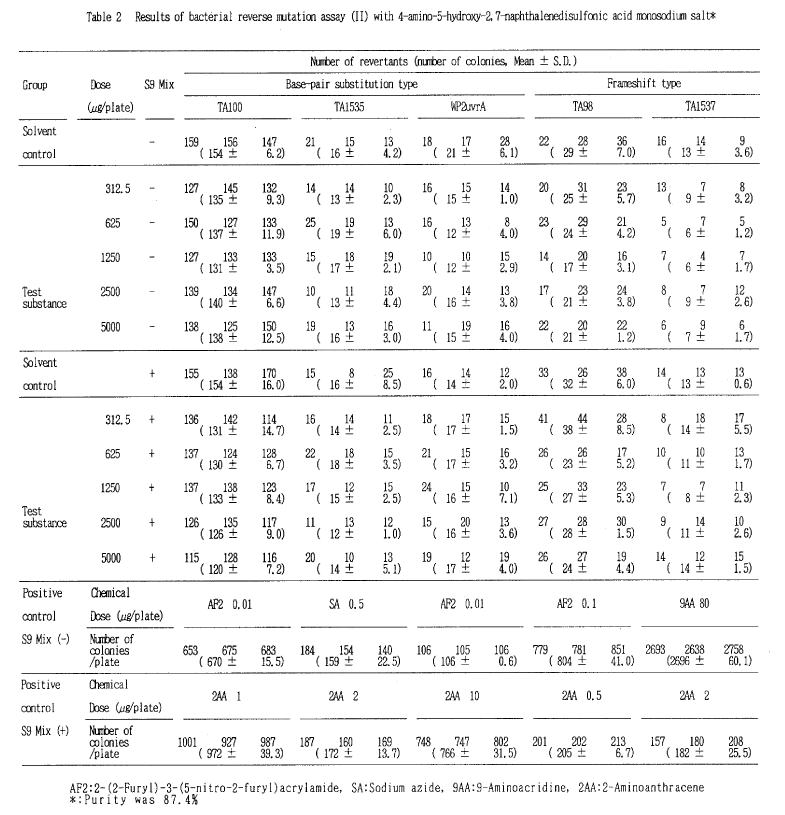 以上の結果に基づき、4−アミノ−5−ヒドロキシ−2, 7−ナフタレンジスルホン酸モノナトリウムは、用いた試験系において変異原性を有しないもの(陰性)と判定した。