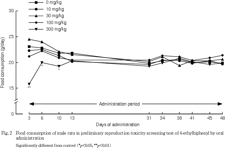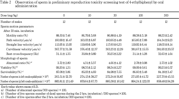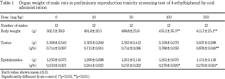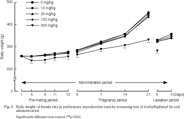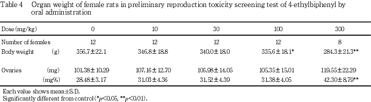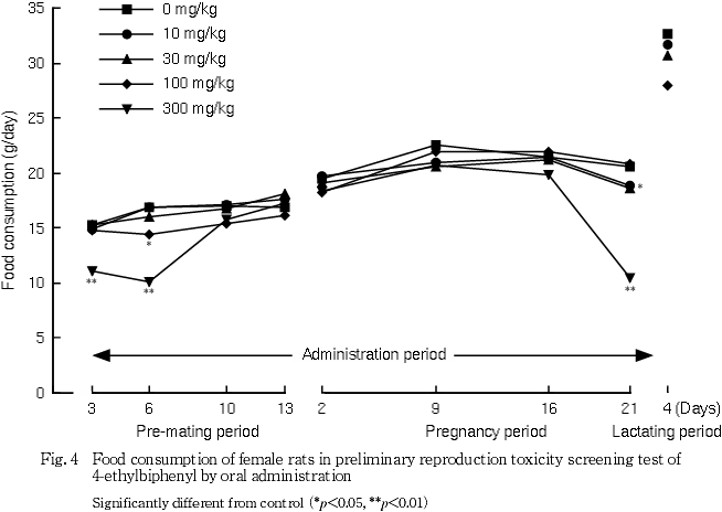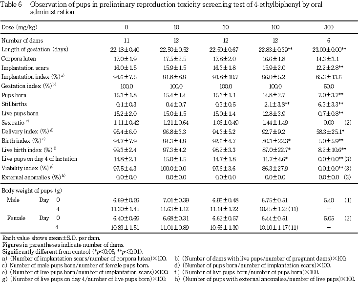 雌に関しては,300 mg/kg群で妊娠末期に4例が死亡した.300 mg/kg群では,一部の例で妊娠末期に体温低下,自発運動の低下,立毛,被毛の汚れおよび軟便がみられた.なお,一般状態観察において,雄の場合と同様に100および300 mg/kg群で認められた流涎は毒性症状とはみなさなかった.体重において,300 mg/kg群で交配前,妊娠期および哺育期に低値がみられた.摂餌量において,100 mg/kg群で交配前に一過性の低値,300 mg/kg群で交配前および妊娠期に低値がみられた.しかし,生存例の剖検所見,器官重量および卵巣の病理組織学検査において投与による影響はみられなかった.なお,300 mg/kg群の死亡例の剖検において,腺胃粘膜暗赤色斑がみられたが,該当部位の病理組織学検査では異常が認められなかったことから,軽微な変化と考えられる.ラットを用いる28日間反復経口投与毒性試験1)では,死亡例が1000 mg/kg群で雄4/10例と雌1/10例,500 mg/kg群で雄1/5例認められており,妊娠動物の方が4-エチルビフェニルの毒性は強く発現する可能性がある.