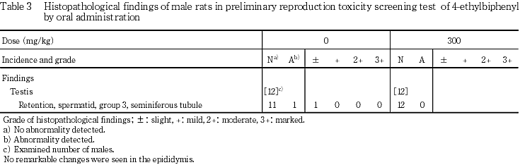 雄においては,いずれの群とも死亡および瀕死例は認められなかった.一般状態では,投与による変化はみられなかった.体重は,100および300 mg/kg群で低値がみられた.摂餌量は,300 mg/kg群で低値がみられた.剖検では,投与による変化はみられなかった.器官重量では,300 mg/kg群で精巣の相対重量の高値がみられた.精子検査では,投与による変化はみられなかった.病理組織学検査では,精巣および精巣上体に投与による変化はみられなかった.