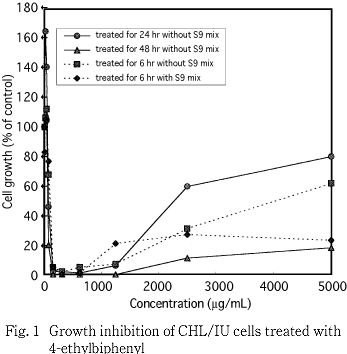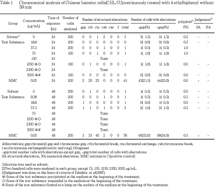 以上の結果より,本試験条件下では4-エチルビフェニルは,染色体異常を誘発しない(陰性)と結論した.