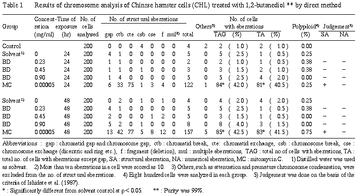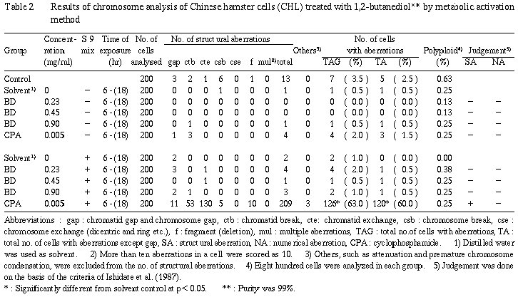 1, 2−ブタンジオールを加えて24時間および48時間処理した各群において、いずれも染色体の構造異常の出現頻度に有意な増加は認められず、全ての処理群で陰性であった。また、倍数性細胞についても同様に有意な増加はみられなかった。代謝活性化法による染色体分析の結果をTable 2に示した。