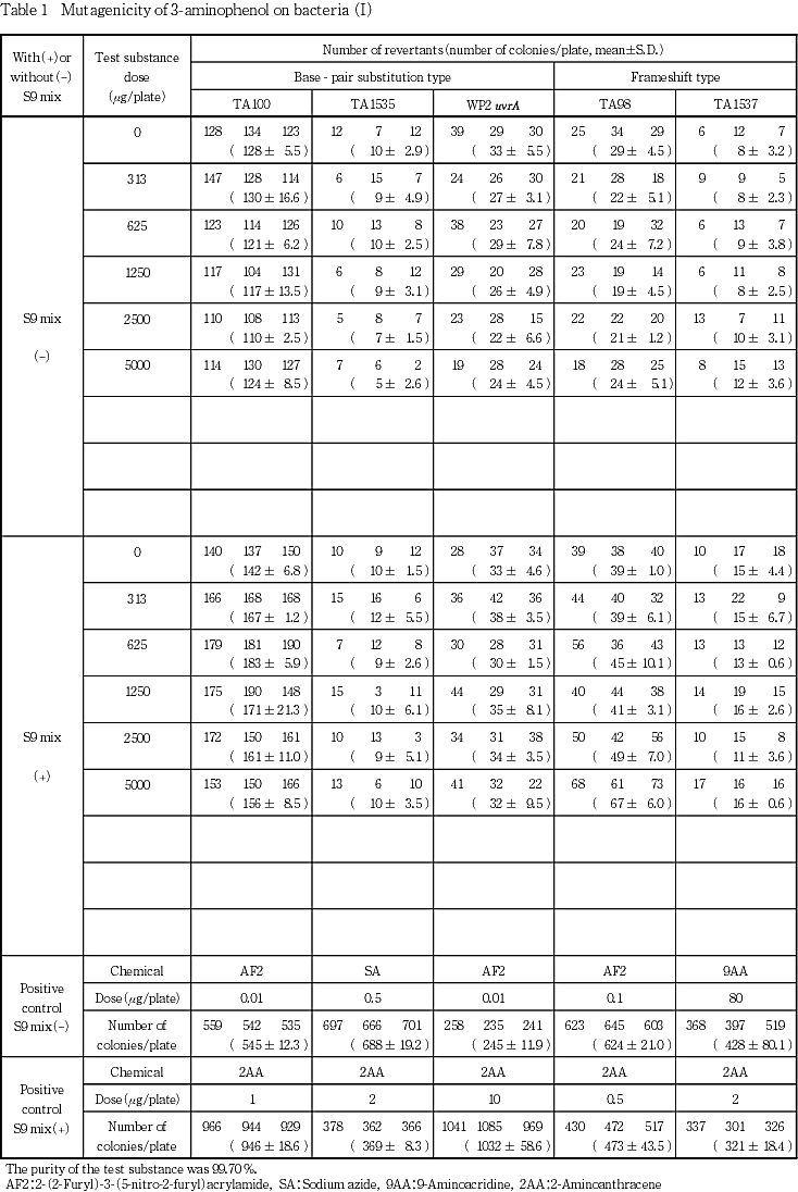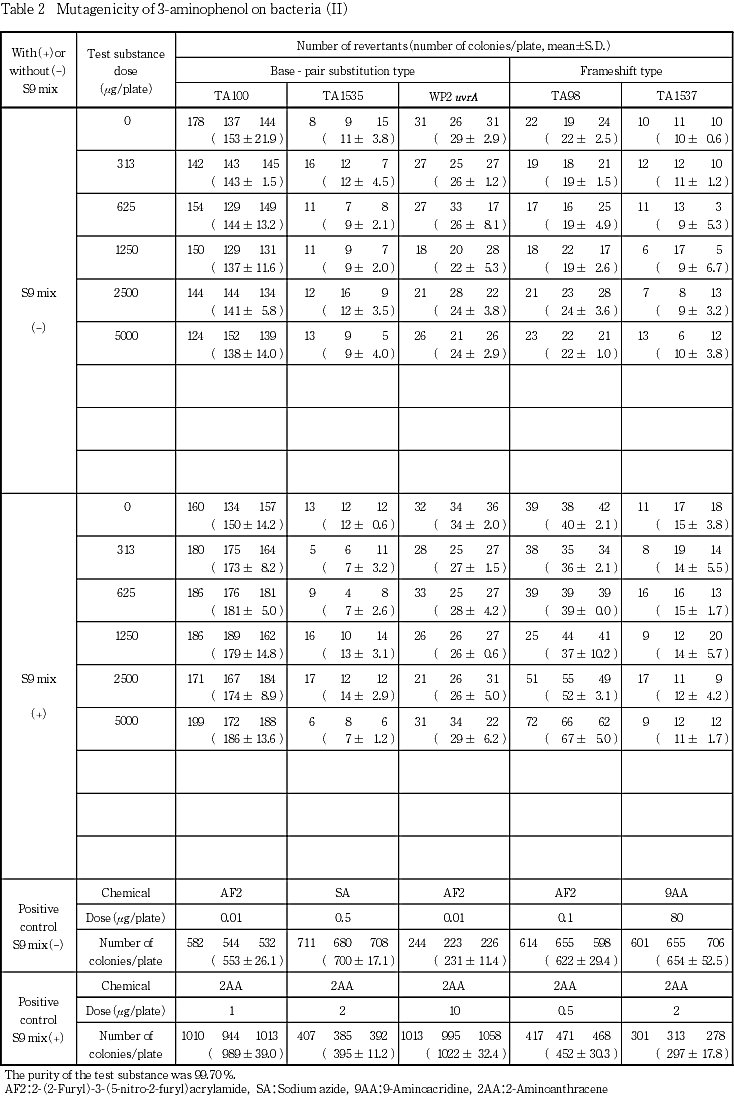 以上の結果から3-アミノフェノールは,用いた試験系において変異原性を有しないもの(陰性)と判定した.