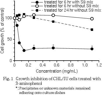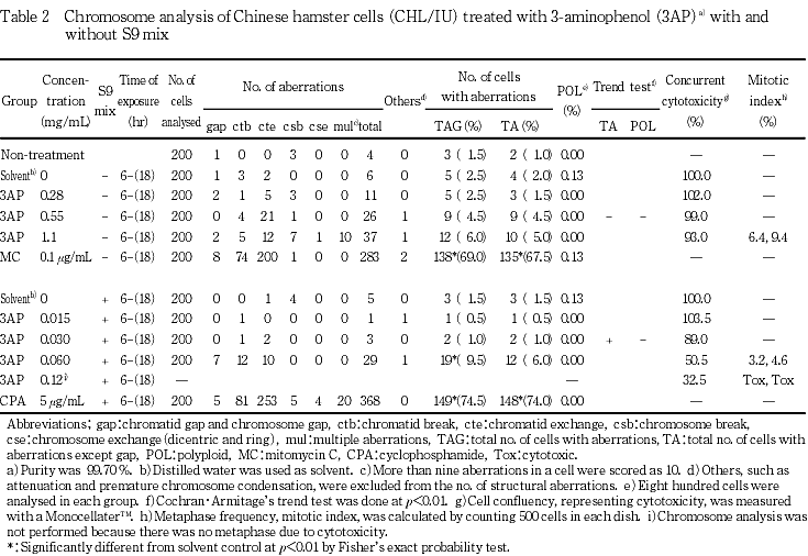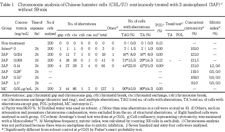 従って,3-アミノフェノールは,上記の試験条件下で,試験管内のCHL/IU細胞に染色体異常を誘発すると結論した.