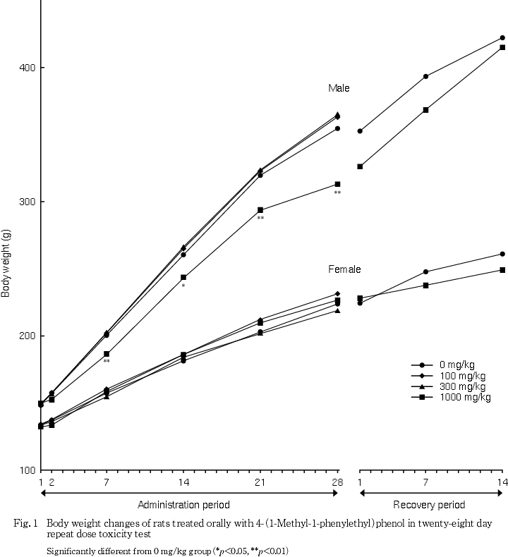以上のことから,300 mg/kg以上の群で,肝臓,腎臓および胃に毒性が認められ,本試験条件下における4-(1-メチル-1-フェニルエチル)フェノールの無影響量(NOEL)は雌雄とも100 mg/kg/dayと考えられた.