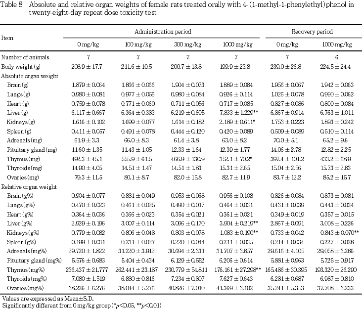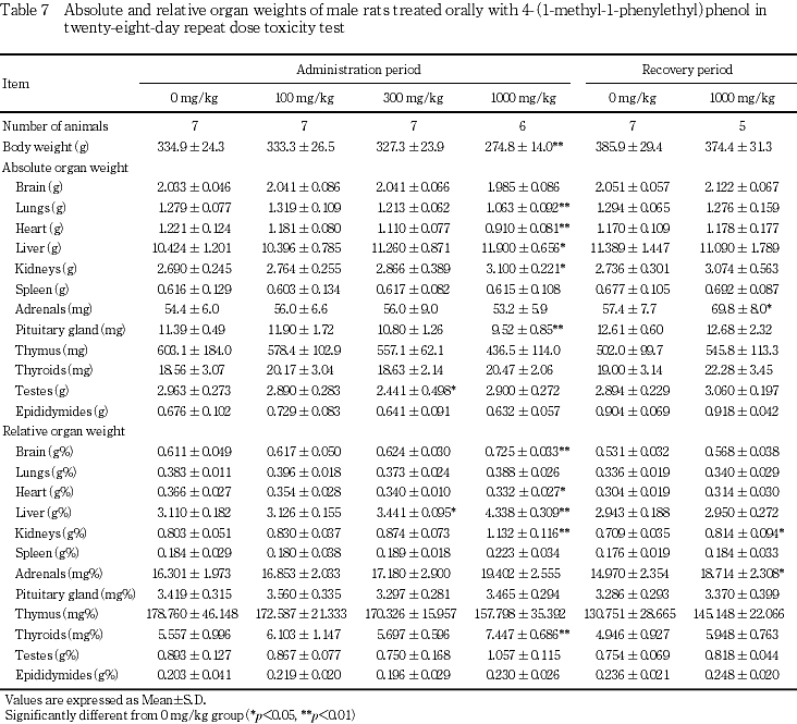 器官重量では,1000 mg/kg群の雄で回復期間終了時に副腎の絶対重量および相対重量の高値が認められた.同群の雄では投与期間終了時にも用量依存的な増加傾向がみられており,切迫屠殺例の副腎も高値であったことから,4-(1-メチル-1-フェニルエチル)フェノール投与の影響と考えられた.この変化は病理組織学的な異常は認められていないものの,腎障害に対する反応性の変化である可能性が考えられた.切迫屠殺例では,肝臓,腎臓および副腎の絶対重量増加の他に,心臓,胸腺および脾臓の絶対重量低下がみられている.胸腺および脾臓の絶対重量低下は腎障害等に起因した衰弱による萎縮性の変化と考えられ,投与期間終了時に1000 mg/kg群の雌でみられている胸腺の絶対重量低下も同様の変化と考えられた.また,投与期間終了時に1000 mg/kg群の雄の心臓重量は低値を示し,切迫屠殺例の場合と一致したが,病理組織学的な変化を伴っていないことから,毒性学的意義については明らかでなかった.
