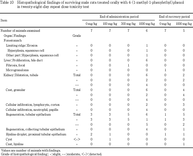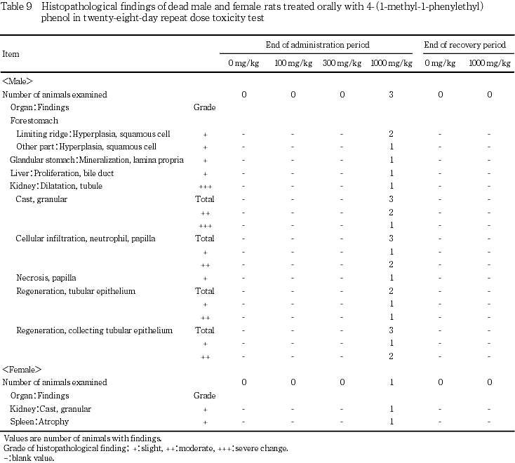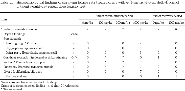 剖検では,1000 mg/kg群の雌雄で前胃粘膜の肥厚あるいは微細隆起部が認められ,病理組織学的に扁平上皮過形成が認められた.同様の変化は,死亡例にも認められ,回復期間終了時には認められなかったことから,4-(1-メチル-1-フェニルエチル)フェノールの直接的な刺激作用に起因する変化であり,可逆性の変化と考えられた.