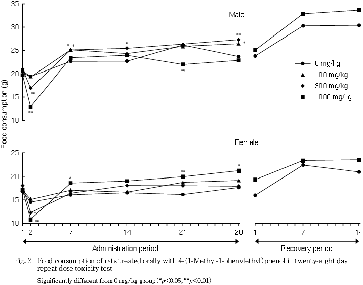 以上,雌雄ともに,1000 mg/kg群では扁平上皮過形成がみられたことから前胃粘膜に対する粘膜刺激性が認められた。また,胆管増殖による肝障害,顆粒円柱等による腎障害も認められた.300 mg/kg群では,腎障害に関連すると考えられる飲水量の増加がみられ,雄で腎障害に関連すると考えられる尿細管上皮の再生例の増加および肝障害に関連すると考えられる肝臓の器官体重重量比の増加が認められた.これらのことから,本試験条件下における4-(1-メチル-1-フェニルエチル)フェノールの無影響量(NOEL)は雌雄とも100 mg/kg/dayと考えられた.