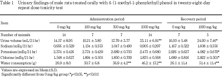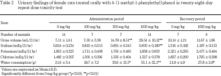 尿検査では,300 mg/kg群の雌および1000 mg/kg群の雌雄で尿量の高値がみられ,300 mg/kg以上の群で雌雄ともに飲水量の高値もみられた.300 mg/kg群の雌および1000 mg/kg群の雌雄では比重の低下および蛋白の減少あるいはpHの低下がみられていることから,飲水量の増加に伴って尿量も増加したものと考えられた.この飲水量および尿量の高値は,3-エチルフェノール等の28日間反復経口投与毒性試験5)の高用量群でも認められていることから,これらのフェノール類に共通の変化と考えられた.一方,300 mg/kg以上の群で沈渣中に大小不同の黒色物質が散見され,この物質の起源,出現機序等については明らかでなかったものの,4-(1-メチル-1-フェニルエチル)フェノール投与および腎障害に関連した変化と考えられ,1000 mg/kg群の雌でナトリウムの有意な低値がみられたのも,腎障害に関連した変化と考えられた.これらの変化は,いずれも回復2週には消失あるいは軽減していることから,可逆性の変化と考えられた.