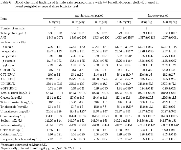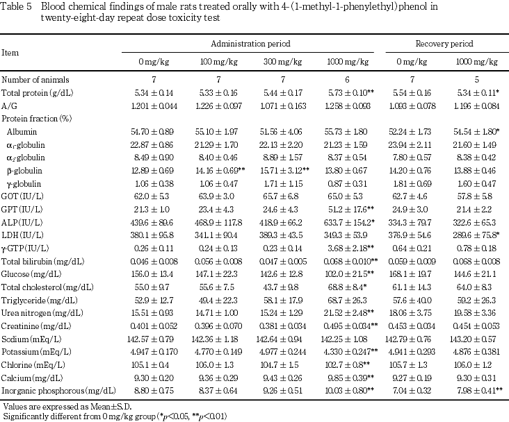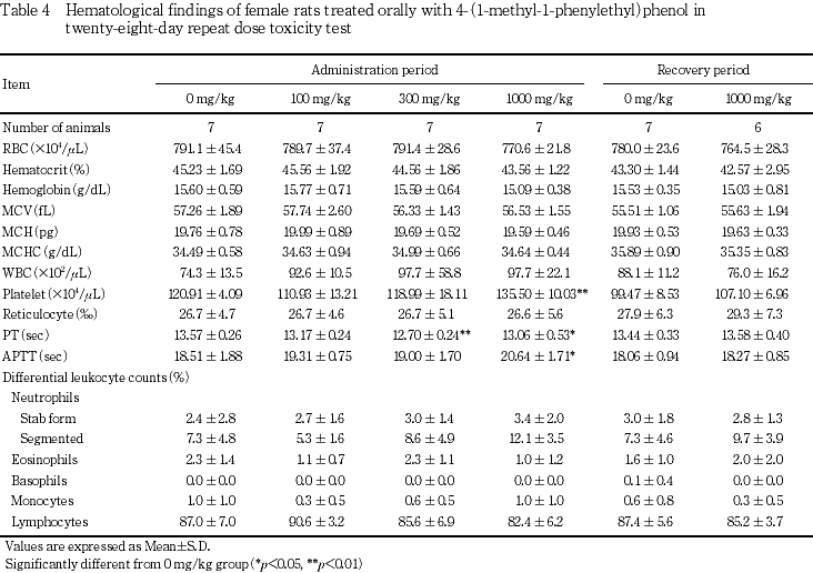 血液学検査では,1000 mg/kg群にのみ,雌雄で血小板数の増加が認められたが,病理組織学検査において脾臓,骨髄等に変化は認められないことから産生性の変化とは考えられず,4-(1-メチル-1-フェニルエチル)フェノールの刺激等による炎症性の変化に伴う二次的なものと考えられた.しかし,増加程度は軽度であること,回復2週で認められないことから,その影響は軽度と考えられた.その他,1000 mg/kg群の雄にみられた白血球数の増加は前胃での炎症性変化等との関連が考えられたが,雌にはみられないことから,その変動機序は明らかでなかった.また,1000 mg/kg群の雌でみられた活性化部分トロンボプラスチン時間の延長については,肝障害に伴う可能性も考えられたが,プロトロンビン時間に変化がなく,出血性変化もないことから,4-(1-メチル-1-フェニルエチル)フェノール投与との関連は明らかでなかった.しかし,これらの変化はいずれも回復期間終了時には認められないことから,可逆性の変化と考えられた.