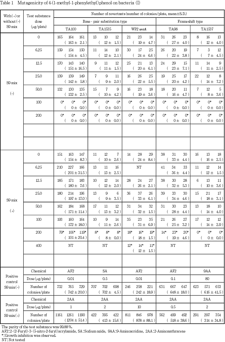 以上の結果から4-(1-メチル-1-フェニルエチル)フェノールは,用いた試験系において変異原性を有しないもの(陰性)と判定した.